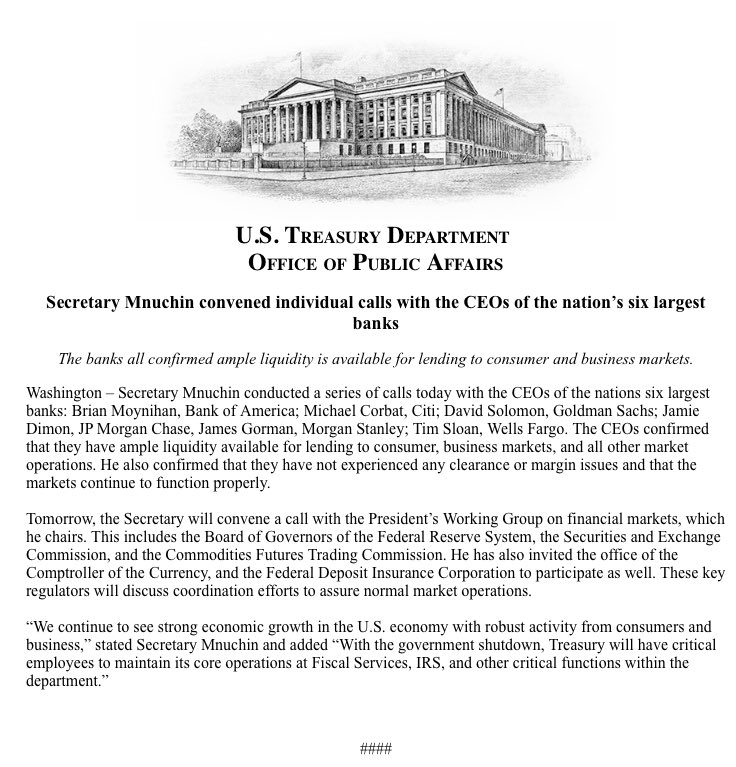 Comunicare con i mercati è un’arte difficile. Lo sa bene il segretario al Tesoro americano che ha emesso domenica un comunicato inusuale. Steven Mnuchin, ex banchiere di lungo corso di Goldman Sachs, domenica scorsa ha rilasciato una dichiarazione molto insolita dove rendeva noto di aver chiamato gli amministratori delegati delle sei più grandi banche del paese. Il responsabile del Tesoro Usa ha reso noto che i sei banchieri gli hanno assicurato che le loro banche sono in buona salute e che hanno “ampia liquidità” da prestare a consumatori e imprese. Inoltre la crescita economica continua ad essere forte. Insomma secondo il Tesoro non ci sono problemi e “i mercati continuano a funzionare correttamente”. Tutto bene, dunque? Non proprio.